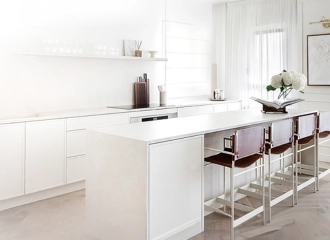 מטבח בסגנון כפרי-לייט. חמימות ביתית עם נגיעות של פעם, המשתלבות באלגנטיות הלבנה.